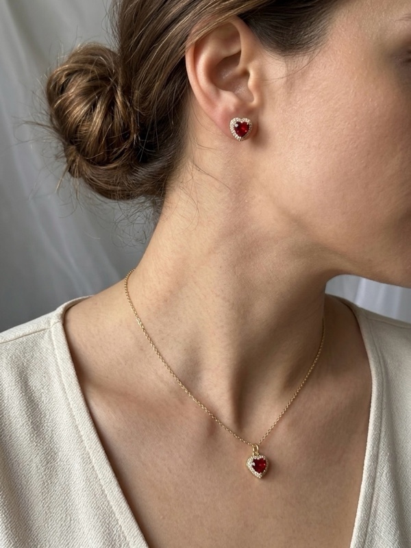 SET CADENA Y TOPOS CIRCON DE CORAZON ROJO DORADO